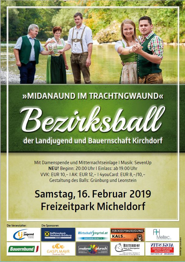 Gemeinsam mit der Bauernschaft Grünburg und Leonstein gestalten wir dieses Jahr den Bezirksball "Midanaund im Trachtngwaund". Unsere Steyrtaler Miniplattler werden den Ball am Samstag, 16.02.2019, eröffnen und um Mitternacht können Sie sich in den Genuss einer lustigen Showeinlage begeben. Weiters haben wir dieses Jahr auch die Kuchenbar über. Hier können Sie unsere hausgemachten Torten und Kuchen, die unsere Mitglieder mit viel Fleiß gebacken haben, kaufen und anschließend genießen. Für die Mitternachtseinlage proben wir bereits seit Mitte Oktober fast wöchentlich. Ganz besonders ist auch, dass unser Leiterteam, Alex und Melanie, ganz groß vom sehr gelungen Plakat lachen - auch darauf sind wir sehr stolz! Wir freuen uns auf Ihren Besuch & schauen Sie bei uns in der Kuchenbar vorbei!