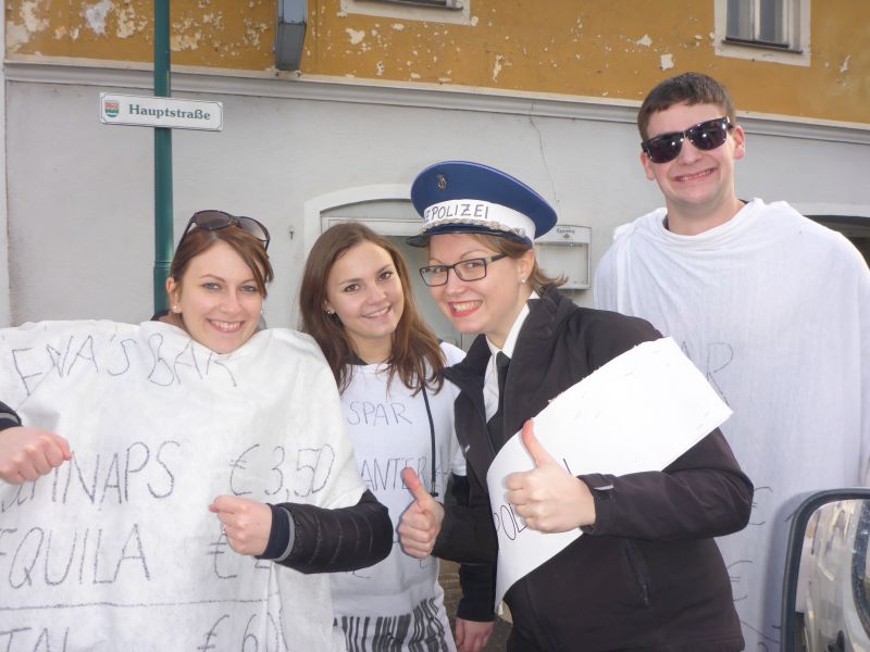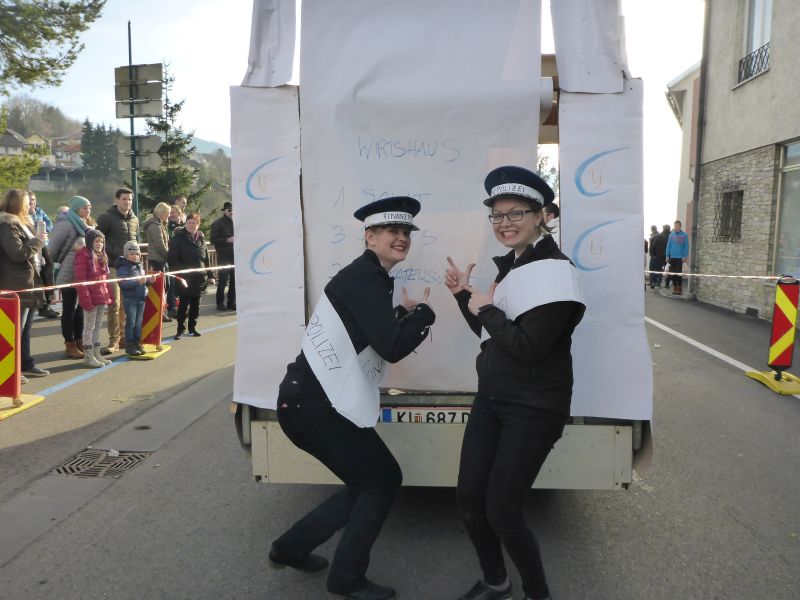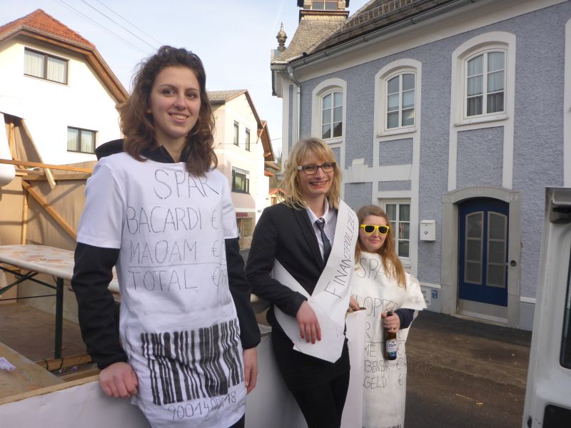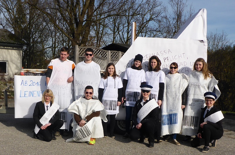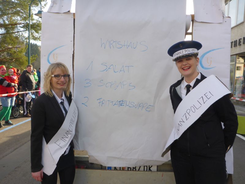 Da zu diesem Zeitpunkt gerade die Registrierkassenpflicht eingeführt wurde, war dies das perfekte Thema für den Umzug. Bereits am Vormittag starteten wir mit den Aufbauarbeiten. Mit vielen fleißigen, motivierten und kreativen Helfern gestalteten wir einen Wagen in Form einer Registrierkassa. Es war ein sehr gelungener Umzug!